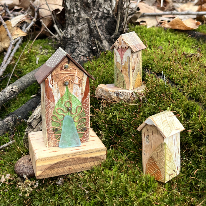 My little houses and neighborhoods are created from an eclectic mix of natural materials, hand-crafted embellishments, and found items. Each is small enough to fit in the palm of your hand.